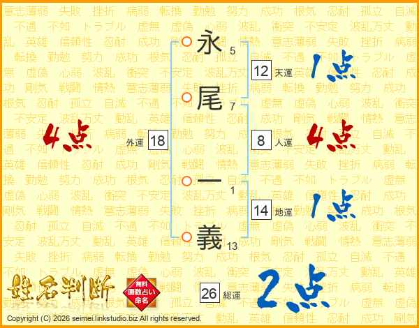 生活面を象徴する運勢です。外部から受ける影響力を表し、結婚運、家庭運や職場、環境への順応性を表します。総運から人運を引いた画数。姓や名が1文字の場合を除く。
