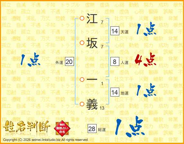 生活面を象徴する運勢です。外部から受ける影響力を表し、結婚運、家庭運や職場、環境への順応性を表します。総運から人運を引いた画数。姓や名が1文字の場合を除く。