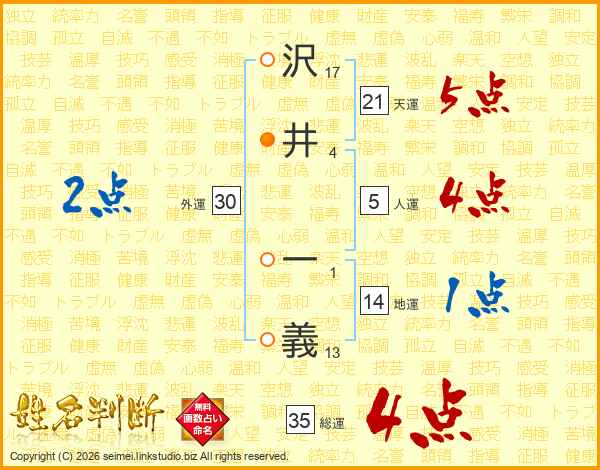 生活面を象徴する運勢です。外部から受ける影響力を表し、結婚運、家庭運や職場、環境への順応性を表します。総運から人運を引いた画数。姓や名が1文字の場合を除く。