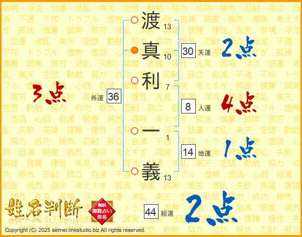 渡(13画)真(10画)利(7画) 一(1画)義(13画)