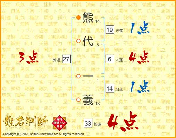 熊代一義さんの総運は33画の4点!