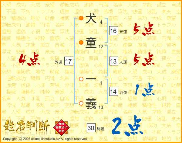 生活面を象徴する運勢です。外部から受ける影響力を表し、結婚運、家庭運や職場、環境への順応性を表します。総運から人運を引いた画数。姓や名が1文字の場合を除く。
