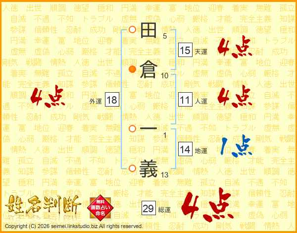 生活面を象徴する運勢です。外部から受ける影響力を表し、結婚運、家庭運や職場、環境への順応性を表します。総運から人運を引いた画数。姓や名が1文字の場合を除く。