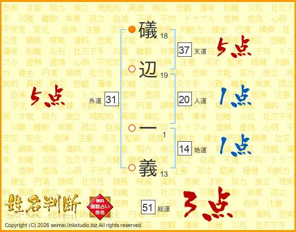 礒辺一義さんの天運は37画の5点!