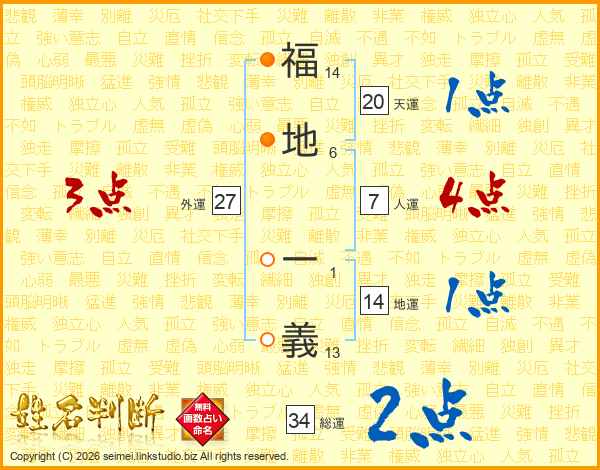 生活面を象徴する運勢です。外部から受ける影響力を表し、結婚運、家庭運や職場、環境への順応性を表します。総運から人運を引いた画数。姓や名が1文字の場合を除く。