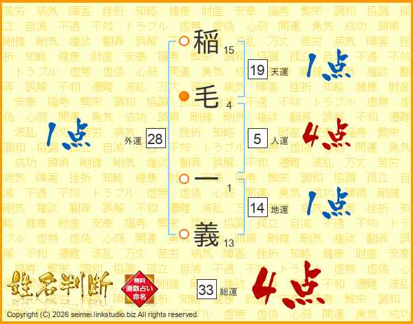 生活面を象徴する運勢です。外部から受ける影響力を表し、結婚運、家庭運や職場、環境への順応性を表します。総運から人運を引いた画数。姓や名が1文字の場合を除く。