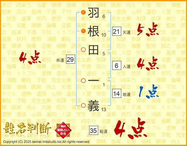 羽(6画)根(10画)田(5画) 一(1画)義(13画)