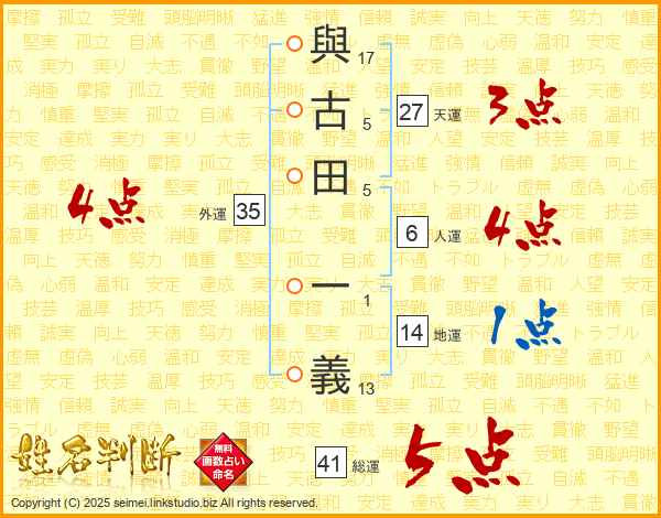 與(17画)古(5画)田(5画) 一(1画)義(13画)