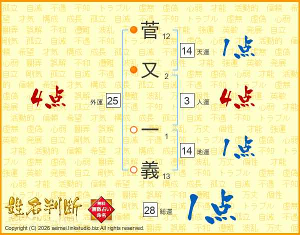 生活面を象徴する運勢です。外部から受ける影響力を表し、結婚運、家庭運や職場、環境への順応性を表します。総運から人運を引いた画数。姓や名が1文字の場合を除く。