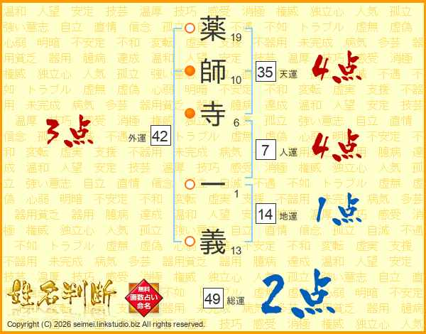 薬(19画)師(10画)寺(6画) 一(1画)義(13画)
