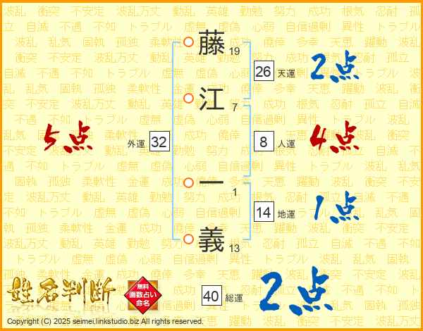 生活面を象徴する運勢です。外部から受ける影響力を表し、結婚運、家庭運や職場、環境への順応性を表します。総運から人運を引いた画数。姓や名が1文字の場合を除く。
