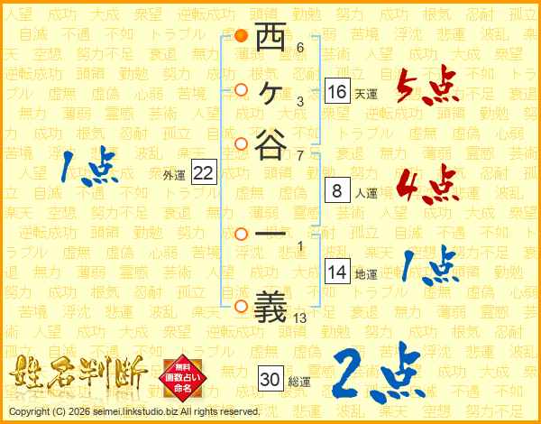 西(6画)ヶ(3画)谷(7画) 一(1画)義(13画)