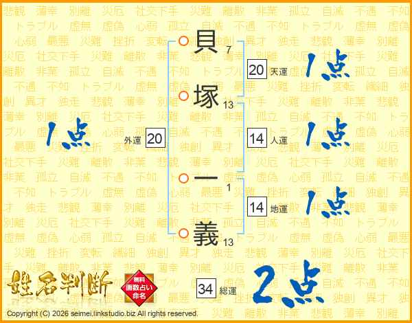 生活面を象徴する運勢です。外部から受ける影響力を表し、結婚運、家庭運や職場、環境への順応性を表します。総運から人運を引いた画数。姓や名が1文字の場合を除く。