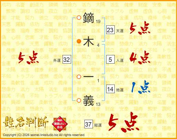 生活面を象徴する運勢です。外部から受ける影響力を表し、結婚運、家庭運や職場、環境への順応性を表します。総運から人運を引いた画数。姓や名が1文字の場合を除く。