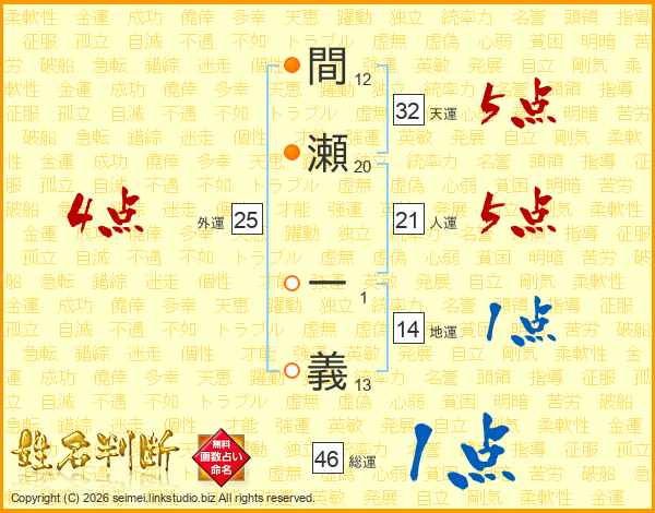 生活面を象徴する運勢です。外部から受ける影響力を表し、結婚運、家庭運や職場、環境への順応性を表します。総運から人運を引いた画数。姓や名が1文字の場合を除く。