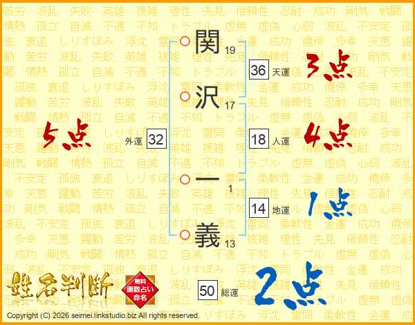 生活面を象徴する運勢です。外部から受ける影響力を表し、結婚運、家庭運や職場、環境への順応性を表します。総運から人運を引いた画数。姓や名が1文字の場合を除く。