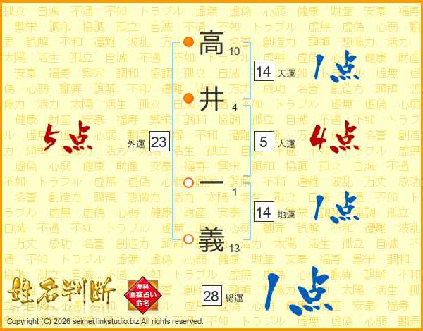 画数の奇数(○陽)と偶数(●陰)の配列で吉凶を占います。どちらかにかたよる名前は大凶名で避ける必要があります。画数の奇数偶数。