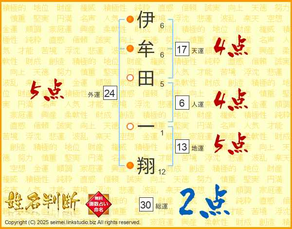 伊(6画)牟(6画)田(5画) 一(1画)翔(12画)