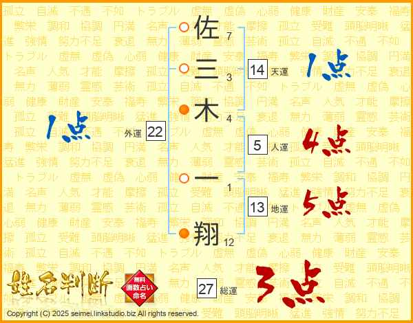 佐三木一翔さんの天運は14画の1点!
