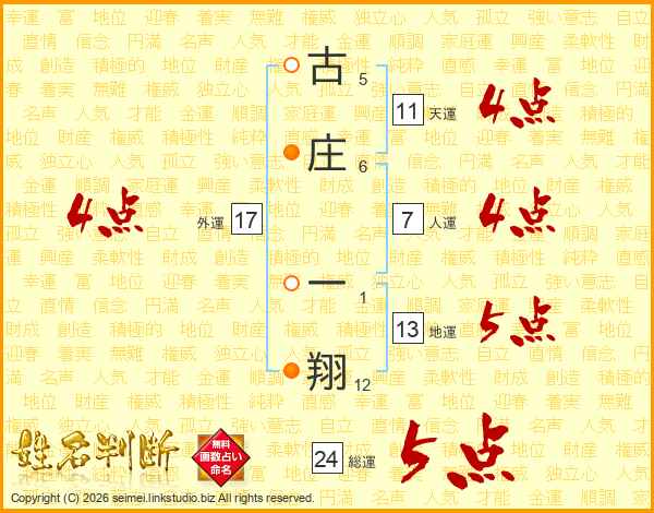 生活面を象徴する運勢です。外部から受ける影響力を表し、結婚運、家庭運や職場、環境への順応性を表します。総運から人運を引いた画数。姓や名が1文字の場合を除く。