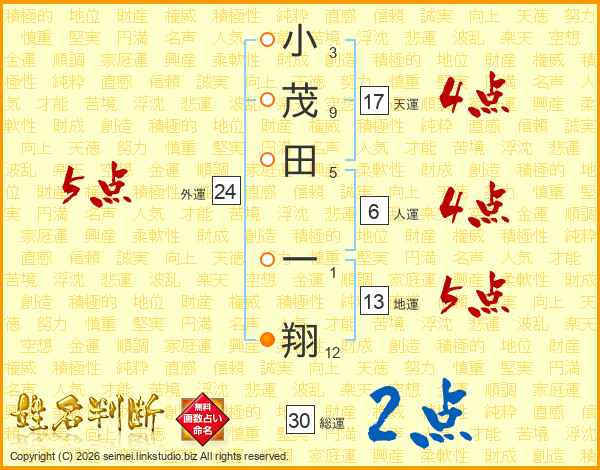 小茂田一翔さんの総運は30画の2点!