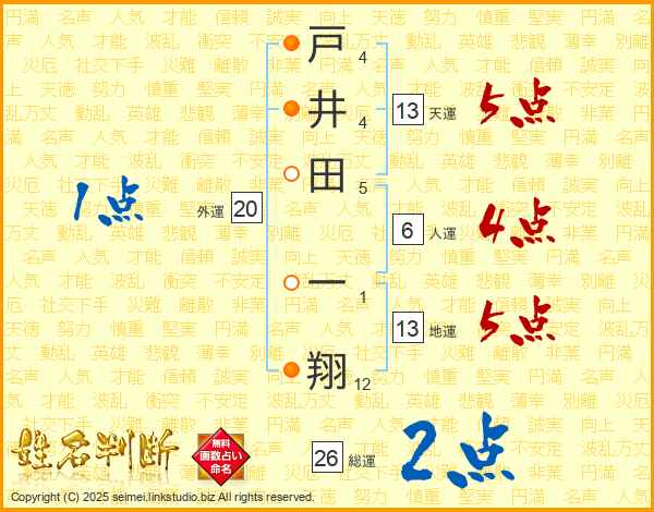 戸(4画)井(4画)田(5画) 一(1画)翔(12画)