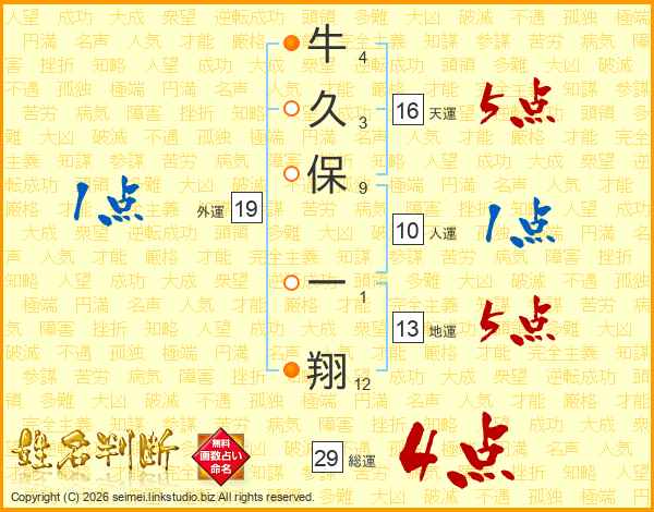 牛(4画)久(3画)保(9画) 一(1画)翔(12画)