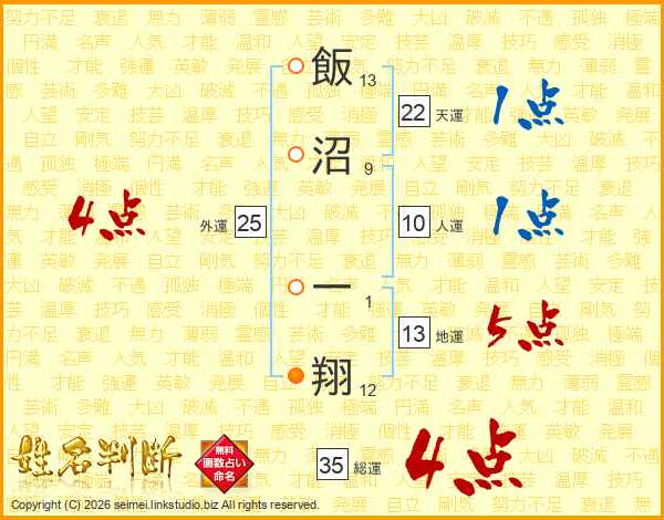 飯沼一翔さんの総運は35画の4点!