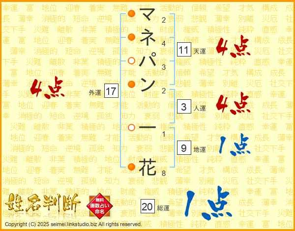 マ(2画)ネ(4画)パ(3画)ン(2画) 一(1画)花(8画)