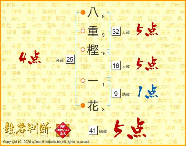 八(8画)重(9画)樫(15画) 一(1画)花(8画)