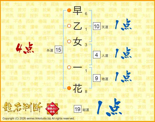 生活面を象徴する運勢です。外部から受ける影響力を表し、結婚運、家庭運や職場、環境への順応性を表します。総運から人運を引いた画数。姓や名が1文字の場合を除く。