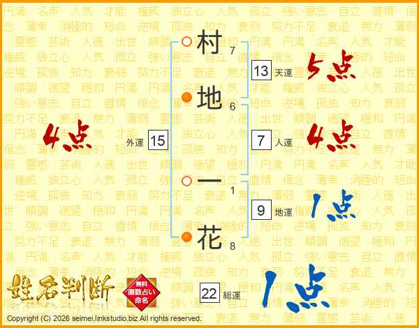 生活面を象徴する運勢です。外部から受ける影響力を表し、結婚運、家庭運や職場、環境への順応性を表します。総運から人運を引いた画数。姓や名が1文字の場合を除く。