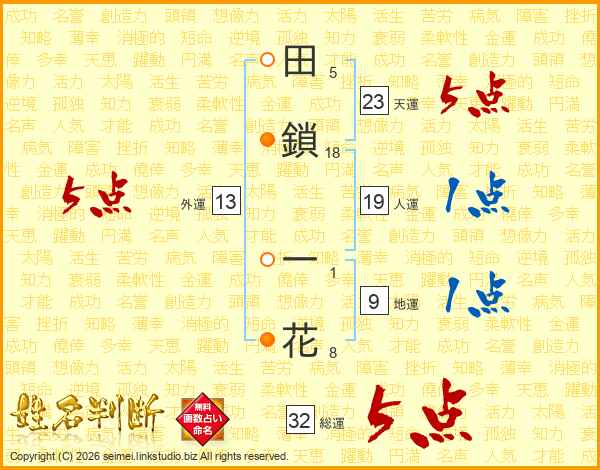 生活面を象徴する運勢です。外部から受ける影響力を表し、結婚運、家庭運や職場、環境への順応性を表します。総運から人運を引いた画数。姓や名が1文字の場合を除く。