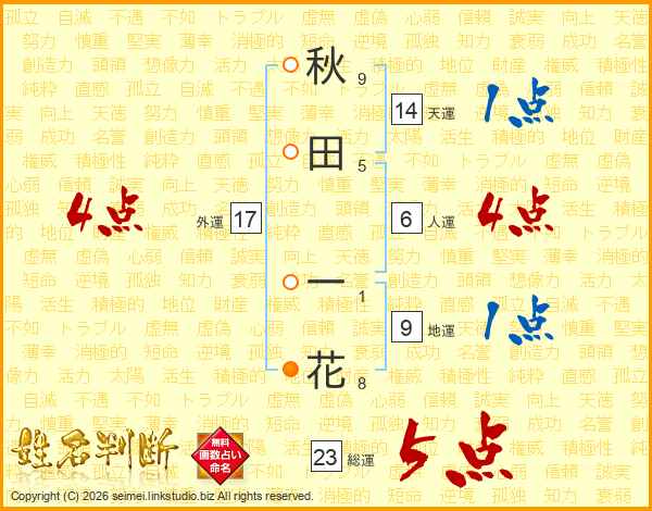 生活面を象徴する運勢です。外部から受ける影響力を表し、結婚運、家庭運や職場、環境への順応性を表します。総運から人運を引いた画数。姓や名が1文字の場合を除く。