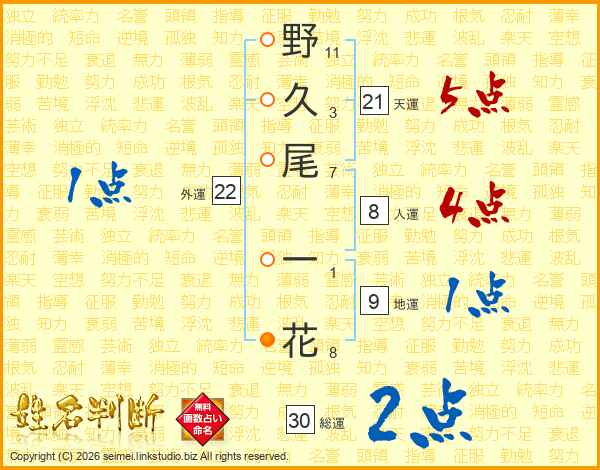 野(11画)久(3画)尾(7画) 一(1画)花(8画)