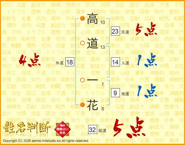 生活面を象徴する運勢です。外部から受ける影響力を表し、結婚運、家庭運や職場、環境への順応性を表します。総運から人運を引いた画数。姓や名が1文字の場合を除く。