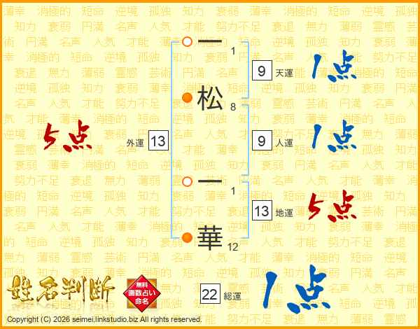 あなたの人生を表す1番重要な運勢です。生涯を通じて影響する総合運となり、主に50歳以降の晩年期に影響を及ぼします。苗字と名前の合計画数。