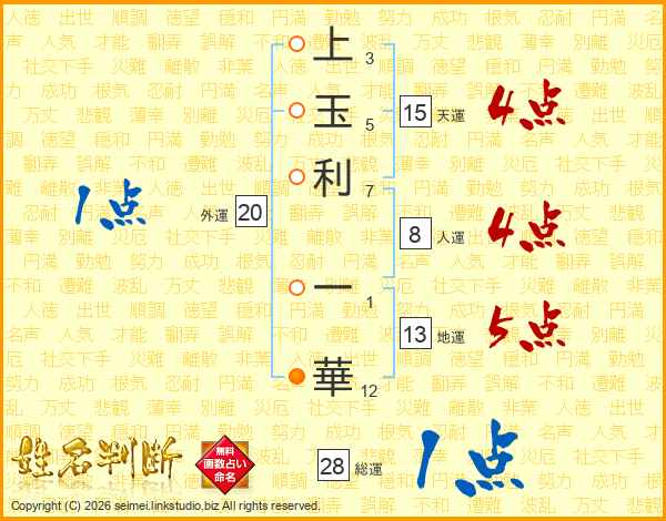 上(3画)玉(5画)利(7画) 一(1画)華(12画)