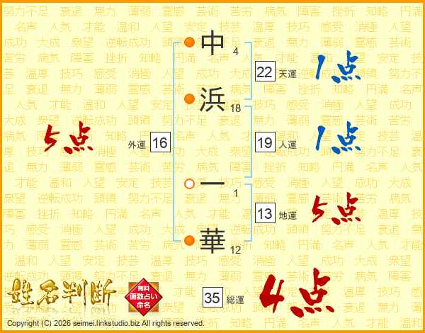 あなたの人生を表す1番重要な運勢です。生涯を通じて影響する総合運となり、主に50歳以降の晩年期に影響を及ぼします。苗字と名前の合計画数。