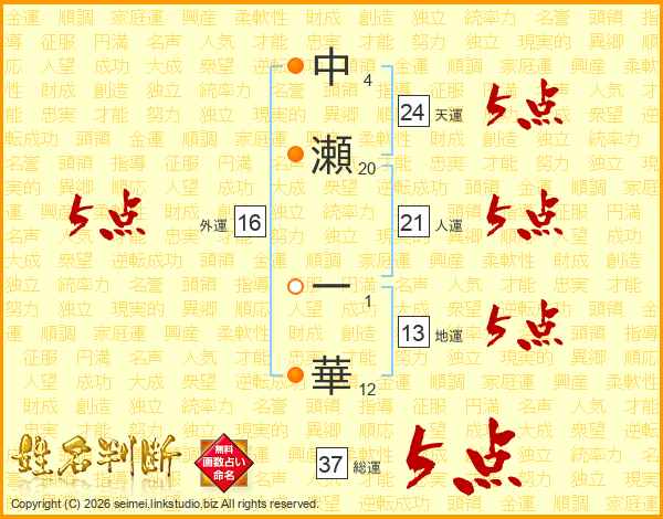 生活面を象徴する運勢です。外部から受ける影響力を表し、結婚運、家庭運や職場、環境への順応性を表します。総運から人運を引いた画数。姓や名が1文字の場合を除く。