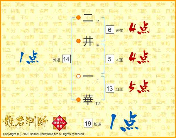生活面を象徴する運勢です。外部から受ける影響力を表し、結婚運、家庭運や職場、環境への順応性を表します。総運から人運を引いた画数。姓や名が1文字の場合を除く。