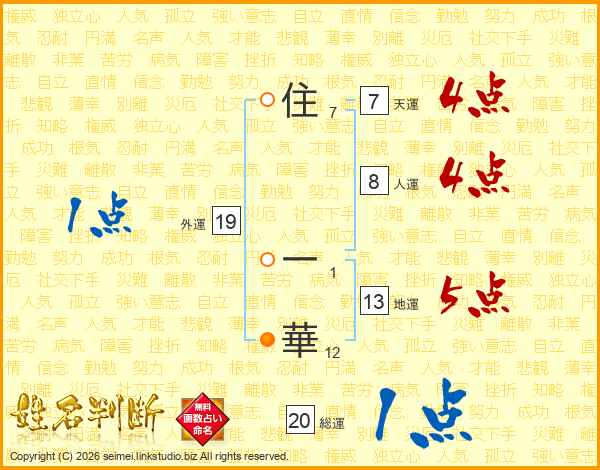 生活面を象徴する運勢です。外部から受ける影響力を表し、結婚運、家庭運や職場、環境への順応性を表します。総運から人運を引いた画数。姓や名が1文字の場合を除く。