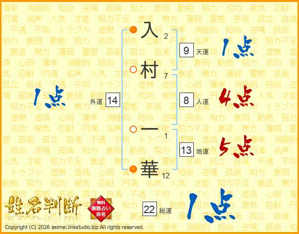 生活面を象徴する運勢です。外部から受ける影響力を表し、結婚運、家庭運や職場、環境への順応性を表します。総運から人運を引いた画数。姓や名が1文字の場合を除く。