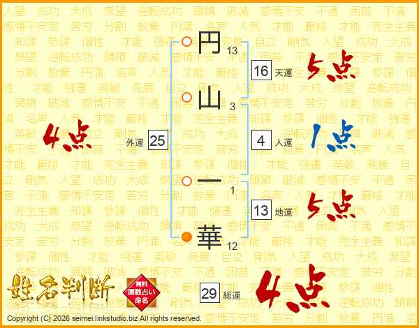 円(13画)山(3画) 一(1画)華(12画)