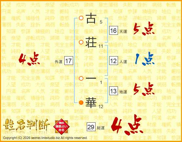 家系が持つ宿命的な運勢を表します。祖先から受け継いだ苗字ですので自分の力が及びません。家柄を象徴します。苗字の合計画数。