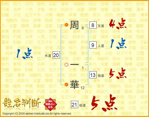 生活面を象徴する運勢です。外部から受ける影響力を表し、結婚運、家庭運や職場、環境への順応性を表します。総運から人運を引いた画数。姓や名が1文字の場合を除く。