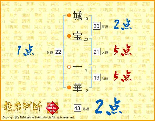 生活面を象徴する運勢です。外部から受ける影響力を表し、結婚運、家庭運や職場、環境への順応性を表します。総運から人運を引いた画数。姓や名が1文字の場合を除く。