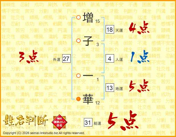 生活面を象徴する運勢です。外部から受ける影響力を表し、結婚運、家庭運や職場、環境への順応性を表します。総運から人運を引いた画数。姓や名が1文字の場合を除く。