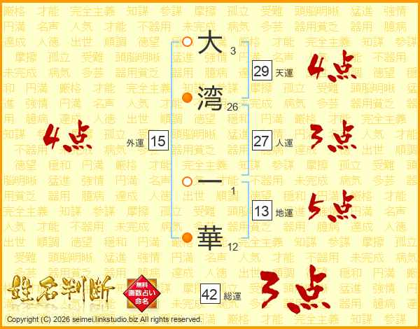 大(3画)湾(26画) 一(1画)華(12画)