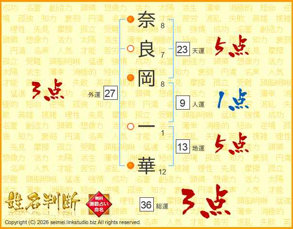 奈(8画)良(7画)岡(8画) 一(1画)華(12画)
